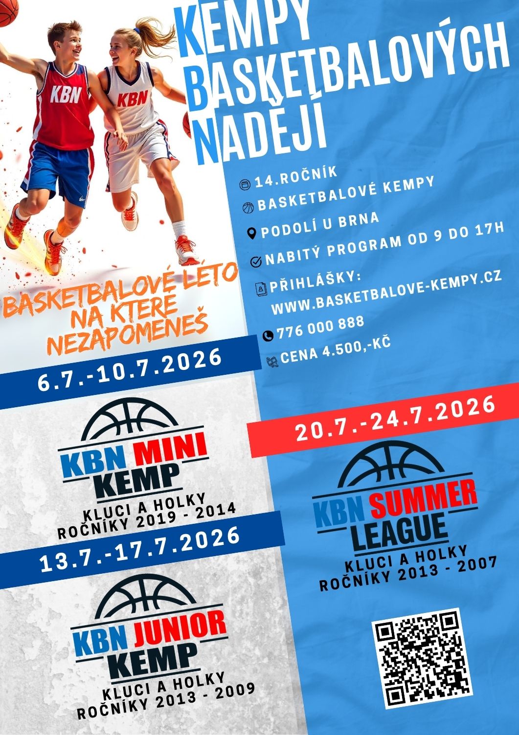 Prázdniny mají být plné zážitků, pohybu a pořádné zábavy – a přesně to přinášejí basketbalové kempy KBN 2026. Prostředí, kde má trénink smysl, hra energii a každý hráč dostane prostor se zlepšovat svým tempem.Na kempech KBN pracujeme na individuálních dovednostech, herním myšlení i týmové spolupráci. Zároveň ale nezapomínáme na to nejdůležitější – radost ze hry, fair play a dobrou atmosféru, díky které děti chodí na tréninky s chutí.I letos jsme připravili tři různé kempy, rozdělené podle věku a úrovně, aby si každý našel výzvu, která ho bude bavit a motivovat.